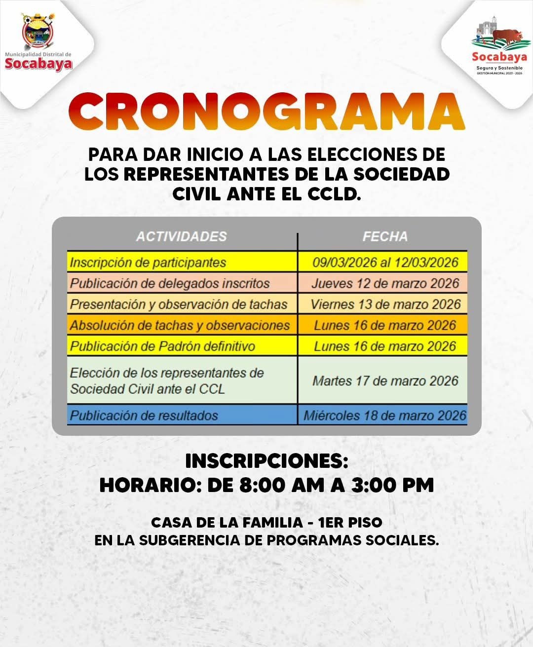 CRONOGRAMA PARA DAR INICIO A LAS ELECCIONES DE LOS REPRESENTANTES DE LA SOCIEDAD CIVIL ANTE EL CCLD